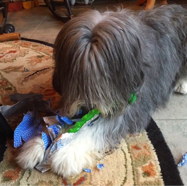 Well. Here I am. In a scene from shred fest yesterday. When my human gave us our gifts, I was the first one to grab one and run and shred. Paxton, the shredder supreme didn’t know what to do. He is used to stealing and THEN shredding. Frodo had to be convinced it was OK and then he did so. I kept stealing gifts. OK. So I guess that already puts me on the naughty list for next year!