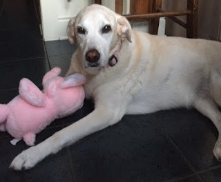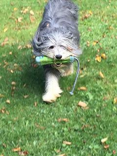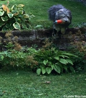 | Here I am retrieving and jumping down a garden wall. I can do this, like 3 thousand times. I LOVE retrieving!!!! |