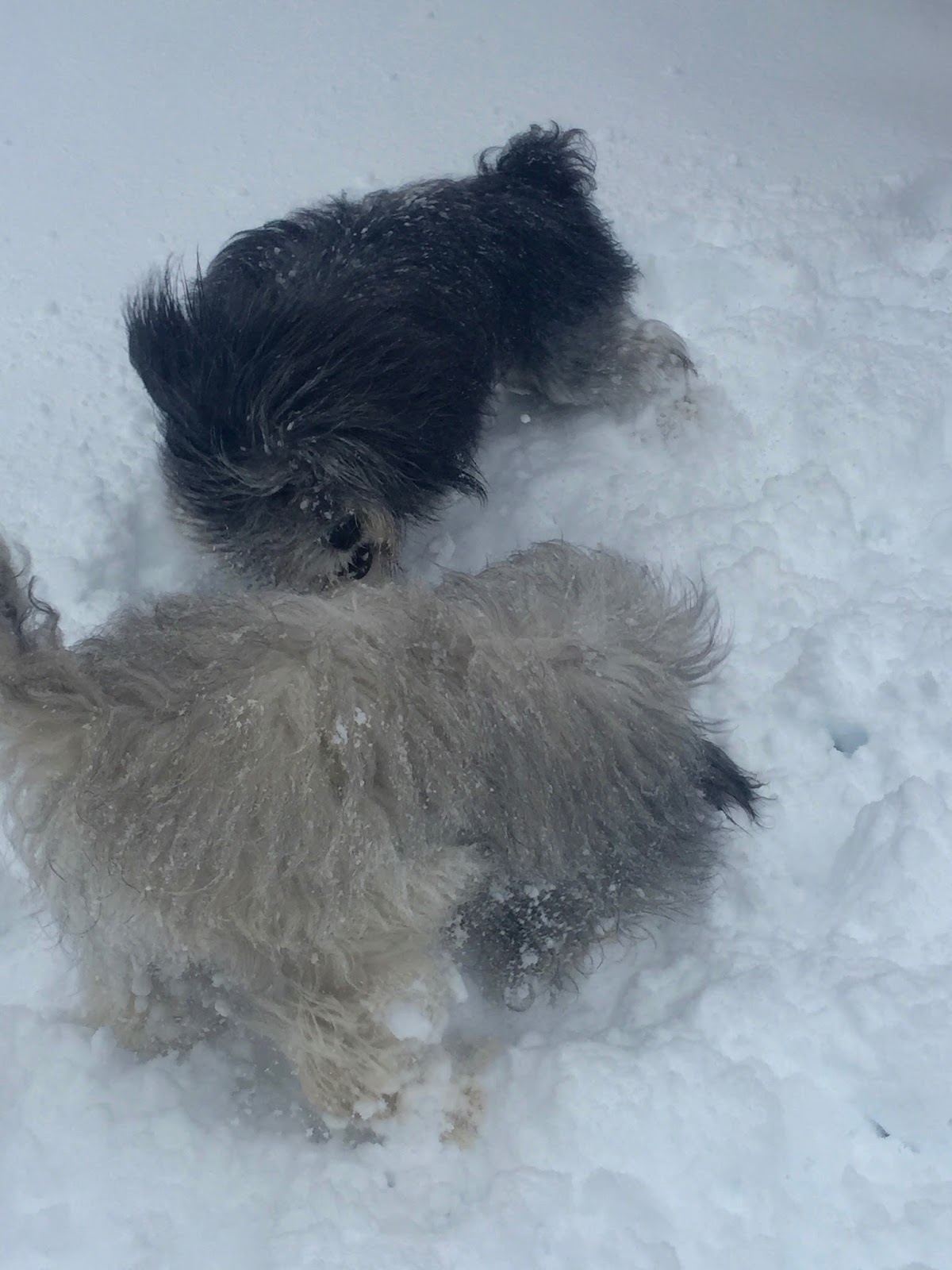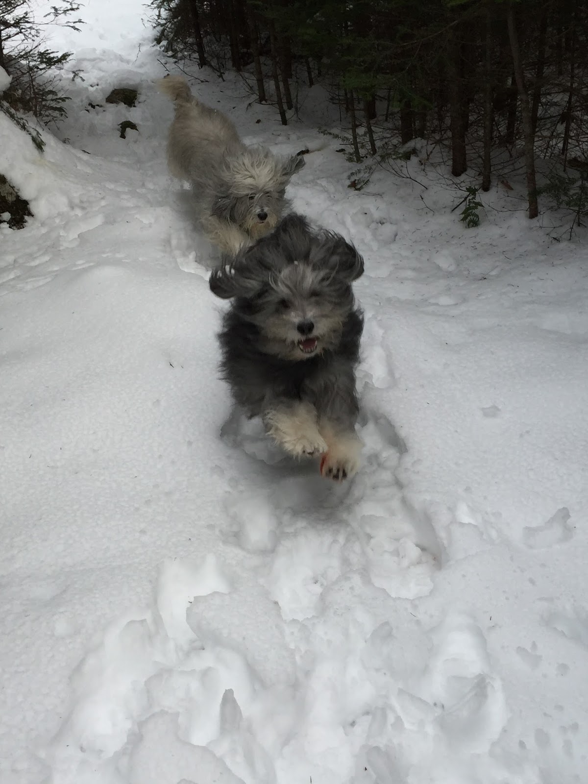 What started though, as a joyful run, quickly became not-so-joyful.  My human, in her effort to get us OUT OF THE HOUSE to burn off some energy, neglected to do something important.  She didn’t put on our snowsuits.  Well- on me or Frodo.  Paxton doesn’t seem get the infamous cannonballs of snow that stick to our legs, our belly and other regions- that become VERY uncomfortable – so he doesn’t have to wear the spandex.  In this photo, you can see some of them forming on my legs.