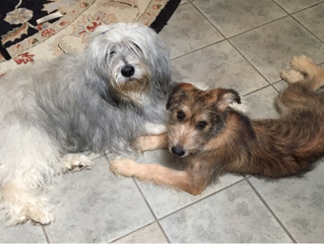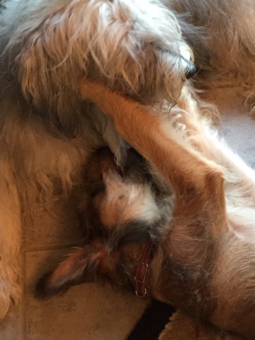 Paxton was a fuzzaholic. From the first night my human brought him home she discovered that he LOVED to find fuzz. And eat it. And if he couldn’t find any, he would just rip some off his own tail. Jaws thankfully hasn’t started the tail thing – but he is QUITE happy to pull fuzz off Frodo. He bites his ears and his tail. And because Frodo IS very patient – he lets him get away with it. He doesn’t do it with me because I am NOT that patient. I did do the zoomies around him outside yesterday – so I AM warming up. SLOWLY.