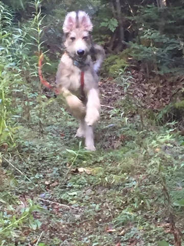 He ALMOST could have had three points yesterday – if he had joined me in the woods on my bunny hunt too. I was hot on the trail, barking and darting back and forth. He BEGAN to follow me, dragging his long line, but my human shouted his name – and go figure, he came back. I did too, but after a few minutes. PON 0. Bunny 1.