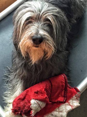 When she got home, we all raced outside when she opened the door. We barked and spun and checked Elroy over for any traces of leftover treats in the hairs on his face. My human had stopped for groceries on the way home and she was putting things in the fridge. And that’s when she noticed Elroy with “something.” He was tearing something apart – and she didn’t know what it was. As she went closer, of course he ran. She somehow managed to corner him and removed the object from his clenched teeth. An oven mitt. Which had been deconstructed. The thumb was missing and it was torn in half. She looked at me and Frodo and said those extremely intelligent words – “What did you do?” We just looked as each other. Why ask? You see what we did. And then came the next intelligent phrase “Who did this?” As IF we would point the paw at one another. We smugly shrugged our shoulders, thinking she would never know. We figured it was payback for not getting all those treats.