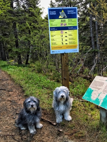 But we had a marvelous day yesterday. It began at 5. Yes – we got my human up and 5. No point in missing a good vacation day. So she took us out for a LONG walk. She started to take us out on a trail and when we began, we saw a warning sign about coyotes. So we didn’t do that hike. This is us with our sad faces.