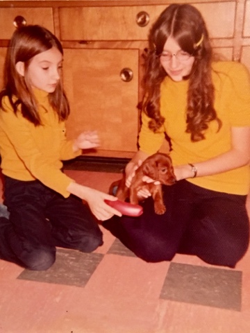And looks at THESE scary sisters. Wait! That’s my human and her sister – with their first dog – an Irish Setter, named Mickey! Love the hair on my human…