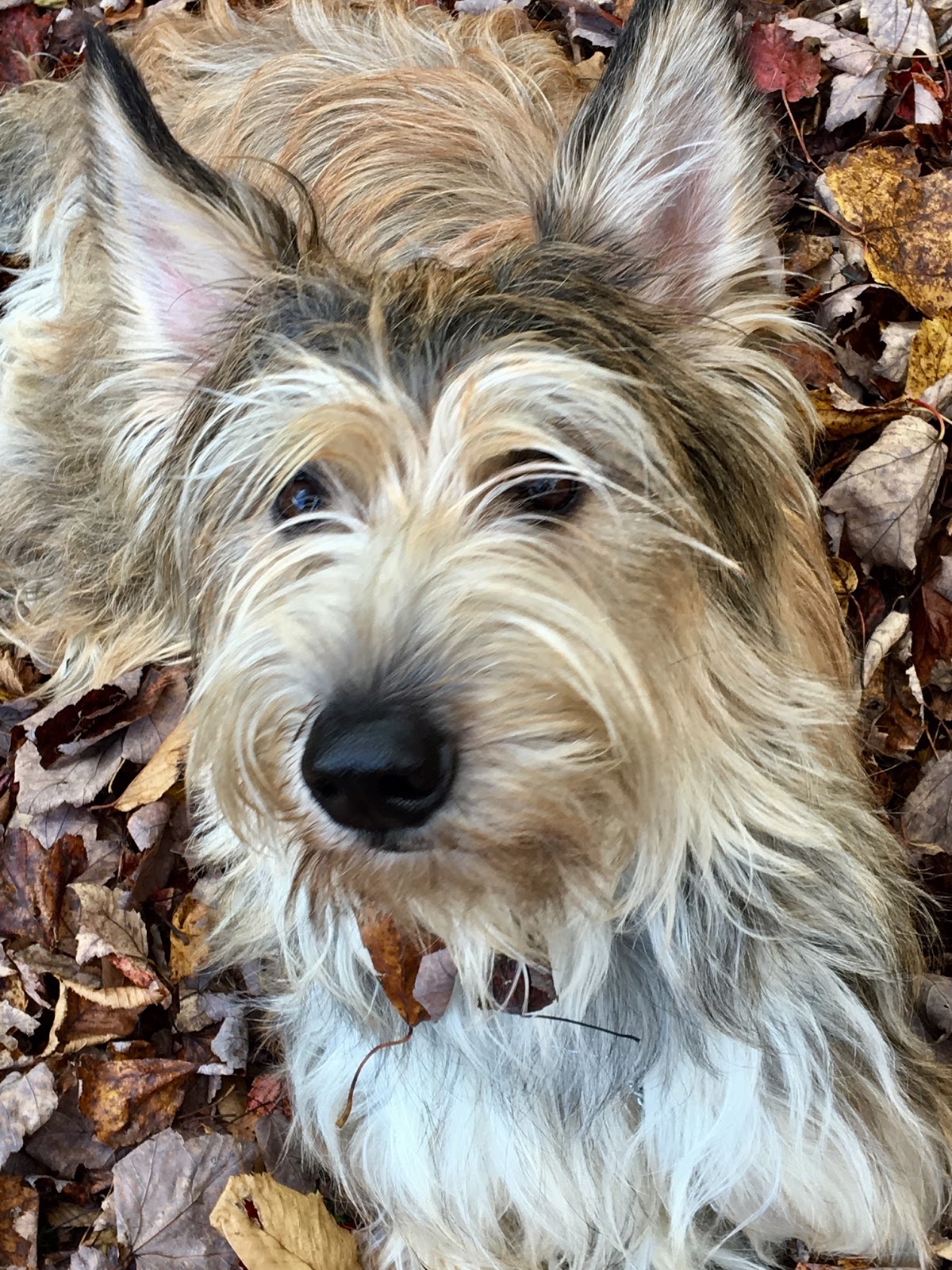 So AFTER that fiasco, she then decided she wanted INDIVIDUAL leaf shots. She really is a glutton for punishment. So she started with our “model” dog – Einstein. All you have to do is set him up and he does whatever you want. My human covered him in leaves and he willingly stayed in place. ALTHOUGH, like a temperamental model, he DID get into the “pout” mode.