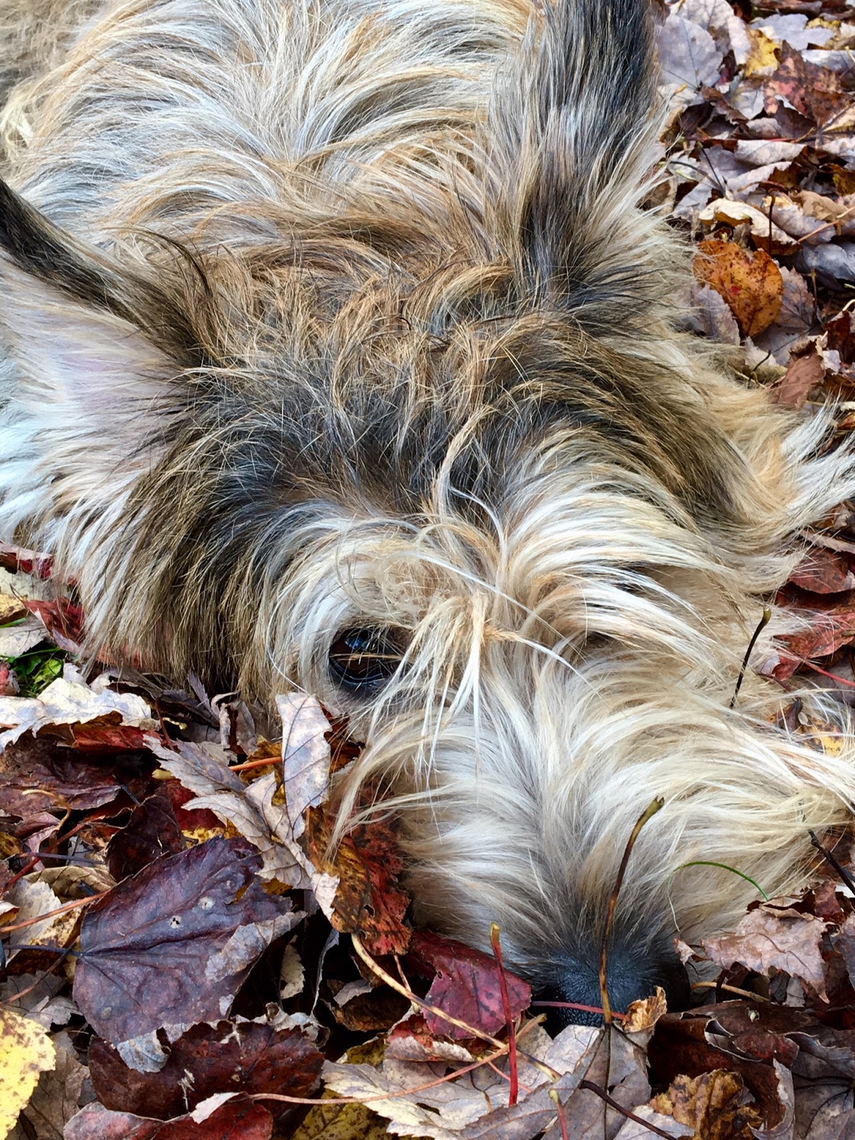 And THEN came the FG. He had been watching the proceedings with me and Einstein from the deck. He couldn’t WAIT to get out. But just TRY and cover him with leaves. It was impossible. She would cover him. He would get up and shake them off. Again and again. Finally she gave up with that and let him just stay on top of the leaves. But he is a picnore pro – and he refused to look at her.