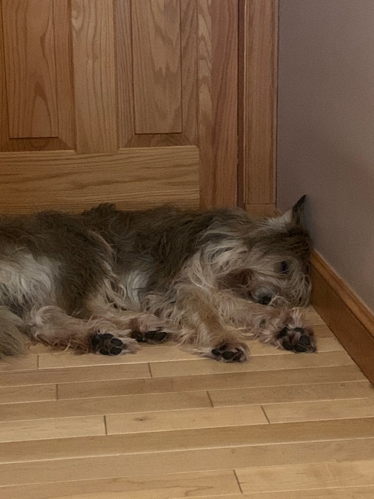 If her highness decides to take a nap herself, we must of course, accompany her. Ordinarily the beatnik would lounge in his pony sized crate. But he can’t. Because that new mat is still inside. Yesterday we witnessed the following… He walked into his crate. He looked at the mat and immediately walked out. He then turned around and went back in. He stood for 20 seconds in his crate, staring at the mat. He came back out and went to sleep in the small hallway between the bedroom and the master bathroom.