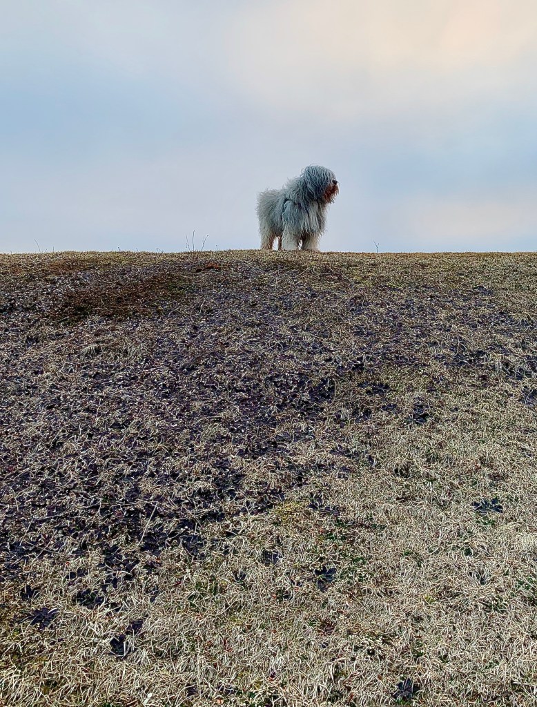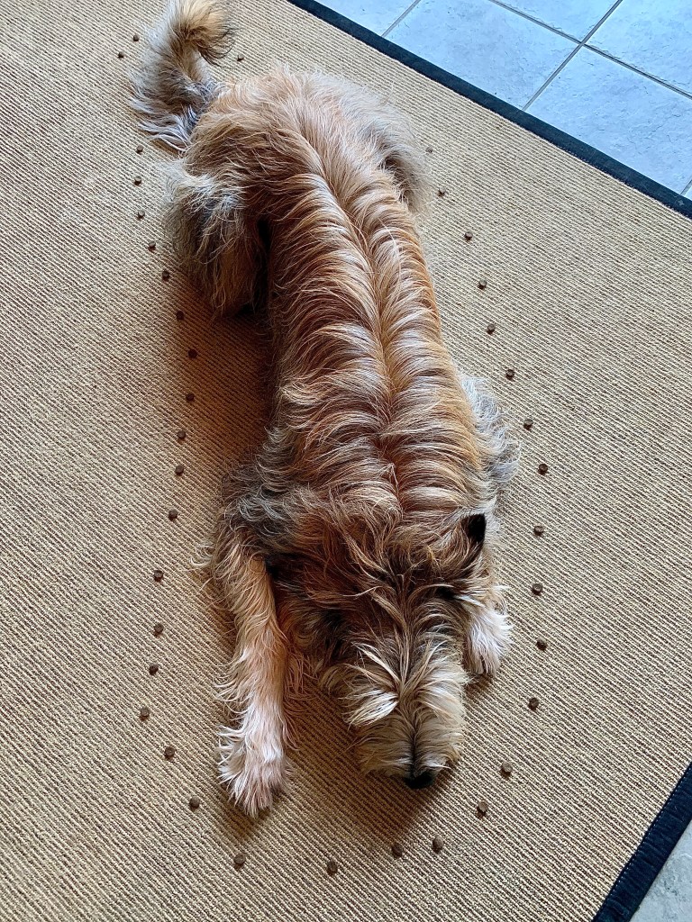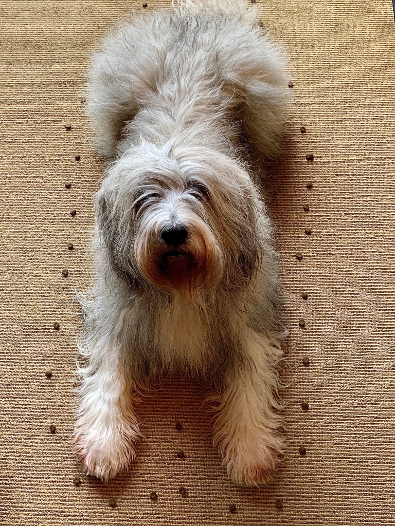 Well. She had to explore this activity further. And she came across something called the Tatort Challenge. She couldn’t find an English language explanation of the task – but from what she was able to gather, it requires putting your dog in a position, surrounding him with kibble or treats and taking his photo. I gather the outline is like a crime scene outline. Here is a video depicting dogs attempting this task.