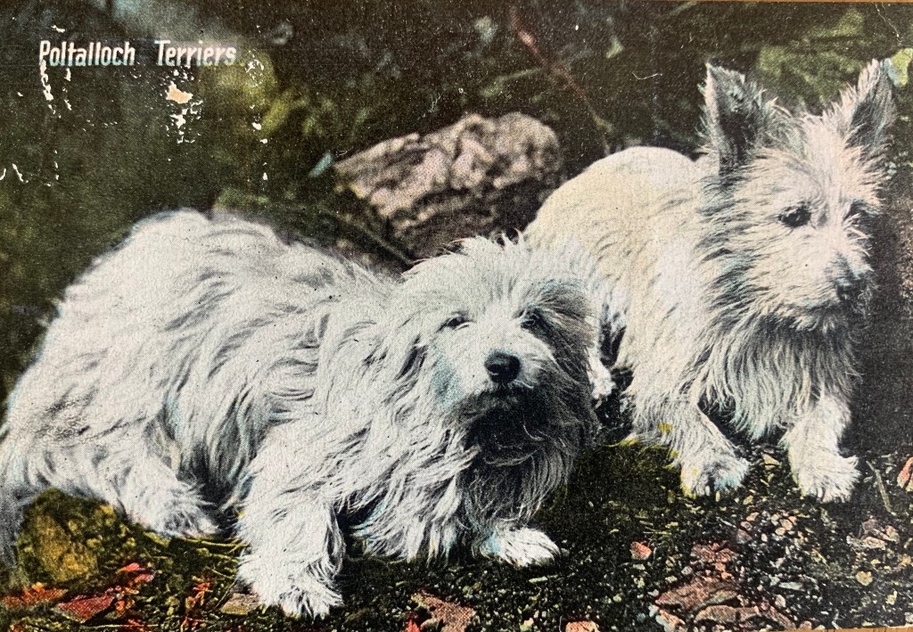 These are labeled as Poltalloch terriers. We know them better as West Highland White terriers or Westies….