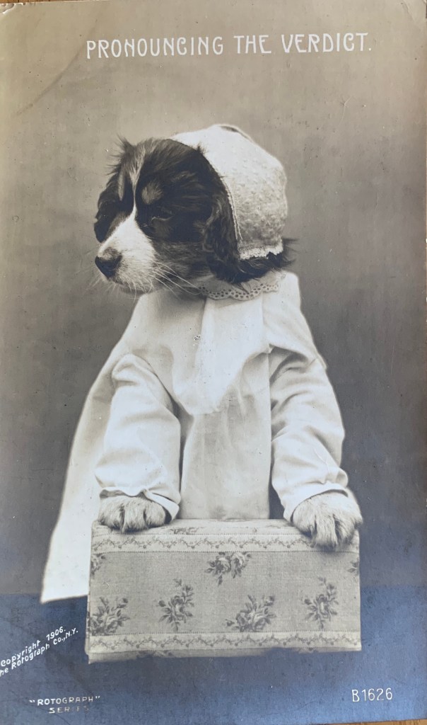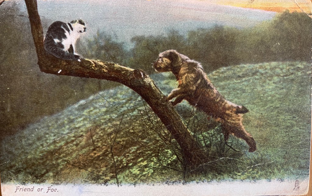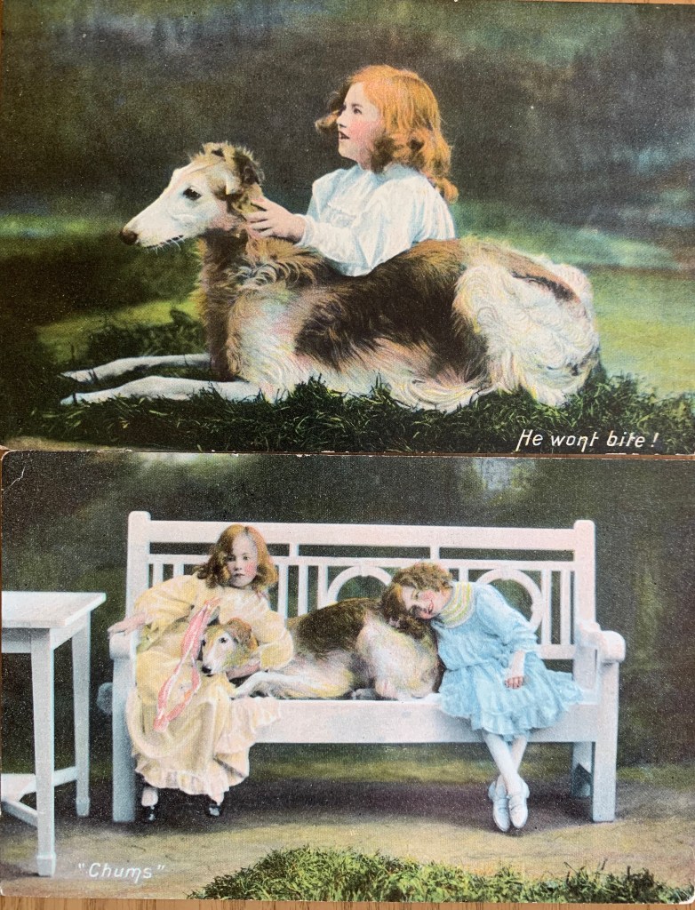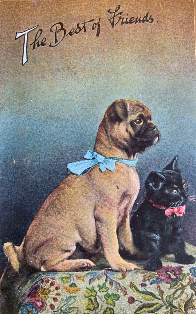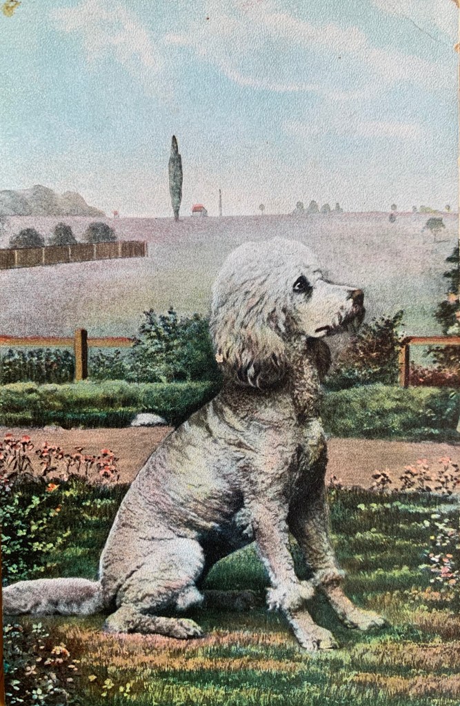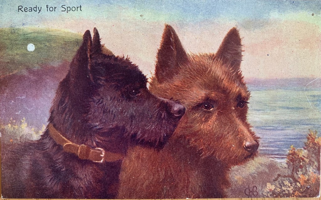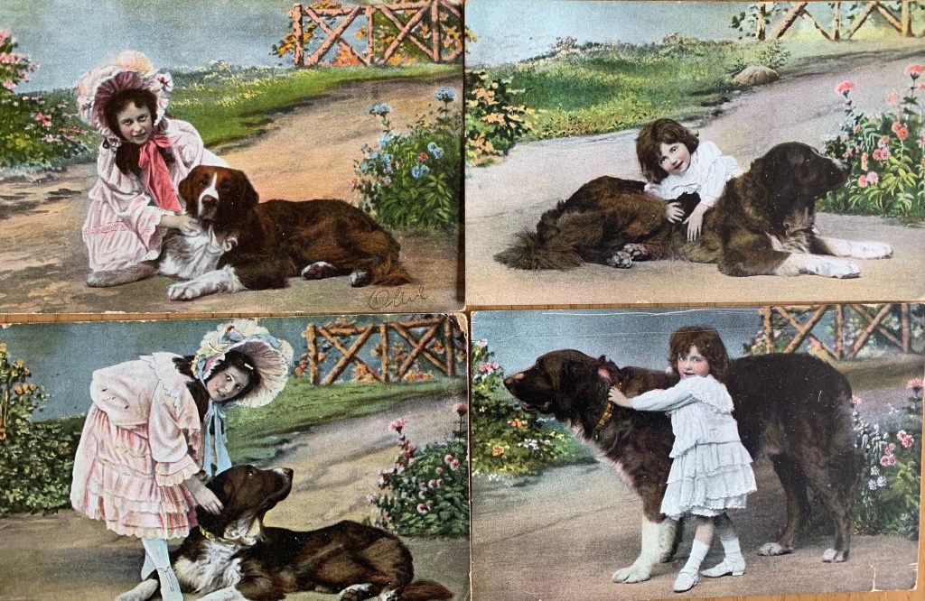 Well as you know, our human collects old dog stuff. Among other junk. And included in her dog collection is surprise surprise- dog postcards. She has a bunch. Like not in the thousands or anything – but enough to put in an album. Or in frames…So today, the Boss suggested I share some with you. So here we go….