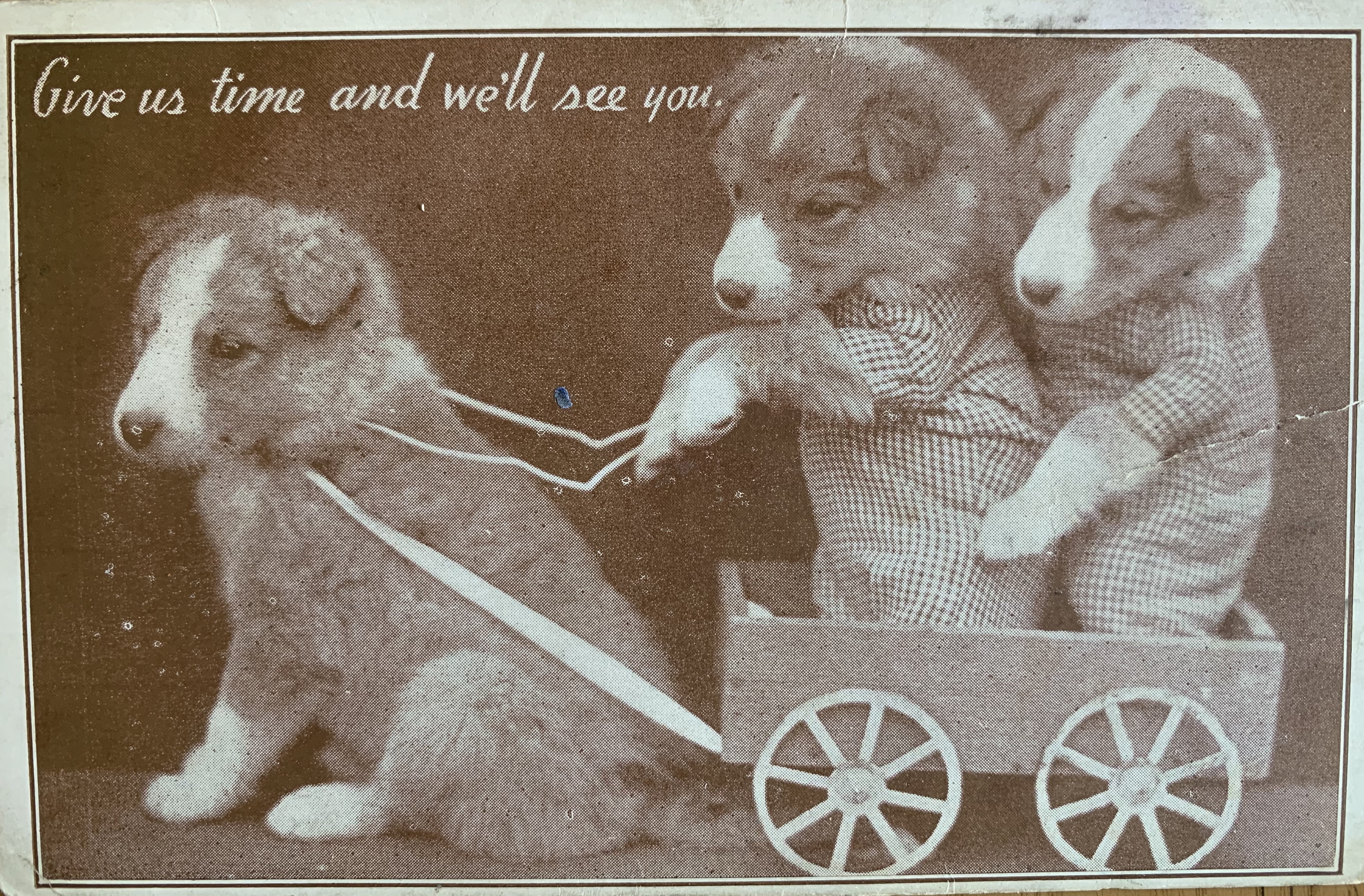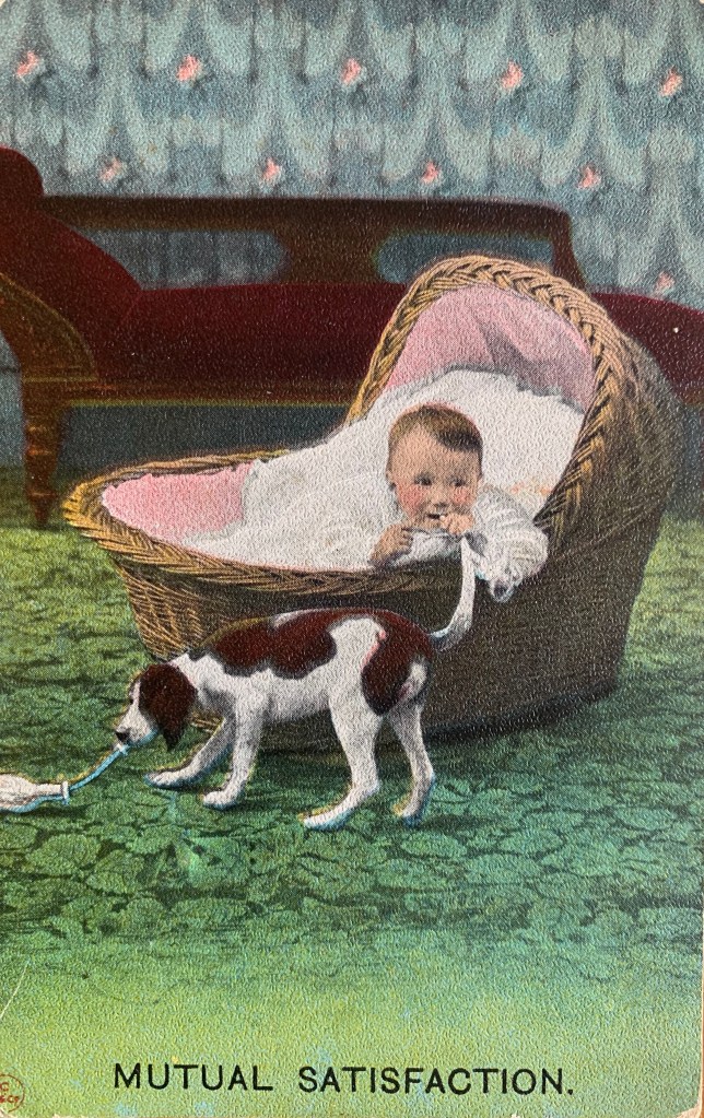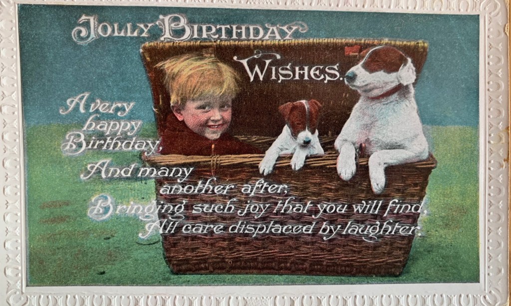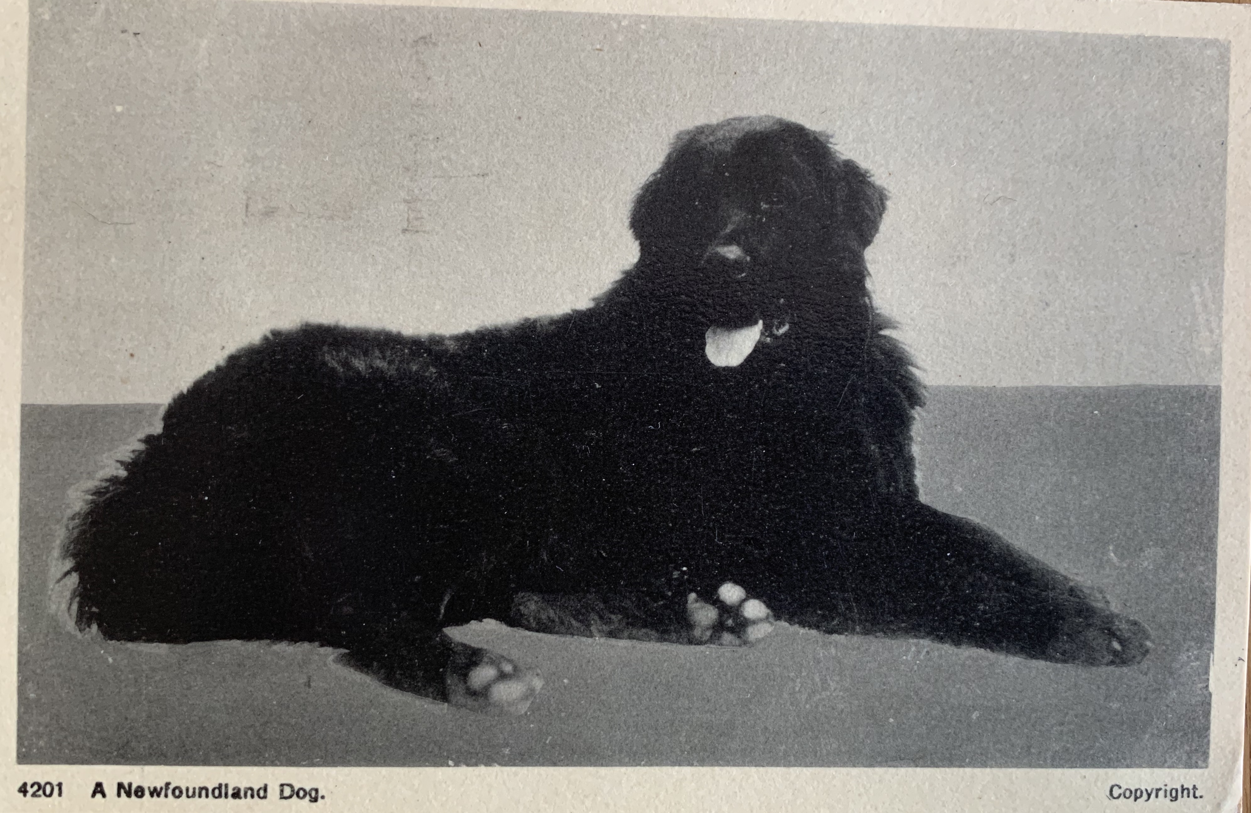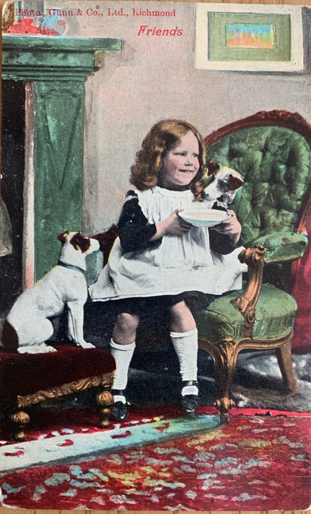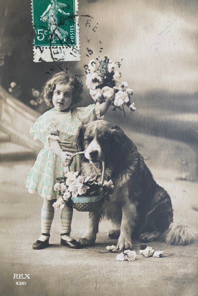 Well as you know, our human collects old dog stuff. Among other junk. And included in her dog collection is surprise surprise- dog postcards. She has a bunch. Like not in the thousands or anything – but enough to put in an album. Or in frames…So today, the Boss suggested I share some with you. So here we go….