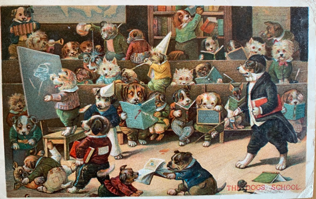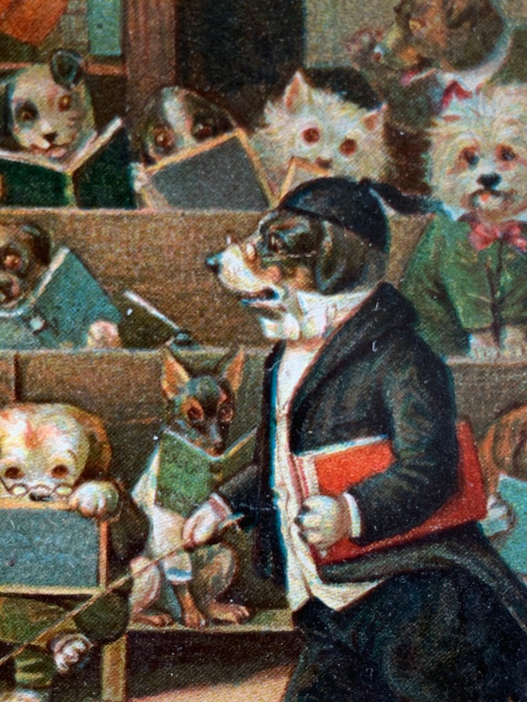 I’ll close with one last card – and it’s probably one of her highness’ favorite cards. Probably because it’s a good depiction of what happens in this household when she tries to teach us anything new. It’s called The Dogs School – and I’ll include some close up shots!