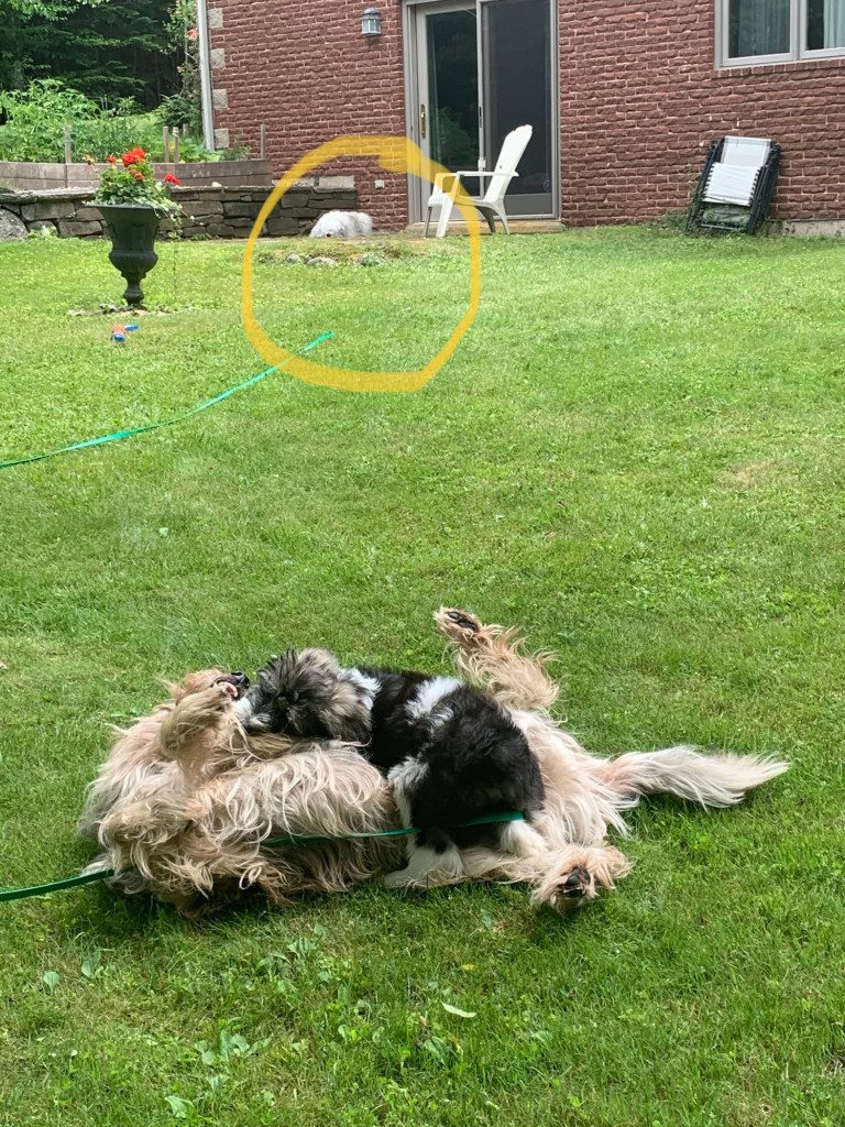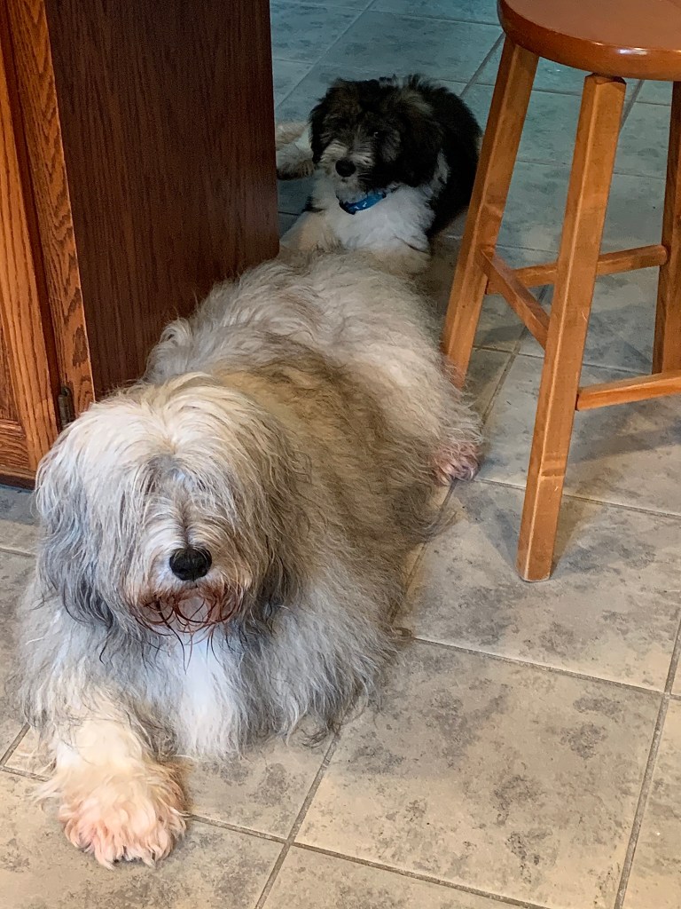 The old guy had to get brushed last night – and I tried to save him by shouting “help – he needs help.” The entire time he was being brushed in the garage. My yelling must have worked because they eventually stopped. The hoverer didn’t even know it had started raining really hard – she couldn’t hear the rain over my shouting. I’m getting the impression that continual shouting is not really appreciated. I can’t WAIT to see how she’s going to get me to stop.