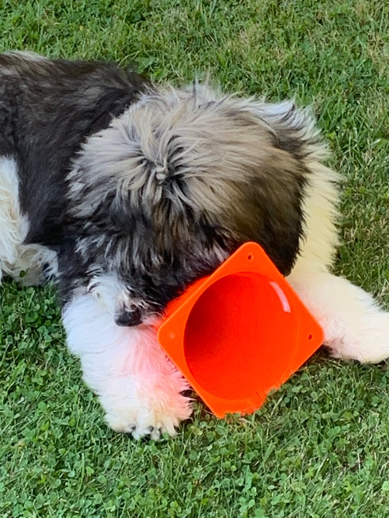 So last night we each got to do some one-on-one obedience training outside. My Enforcer had to dig out and dust off all the obedience training props in the garage. Like the orange cones. I was initially fine with them, but having the current attention span like that of a bee in an Amsterdam tulip farm, I quickly tired of the cones and simply decided to see if they made good chew toys. That idea was quickly discouraged.