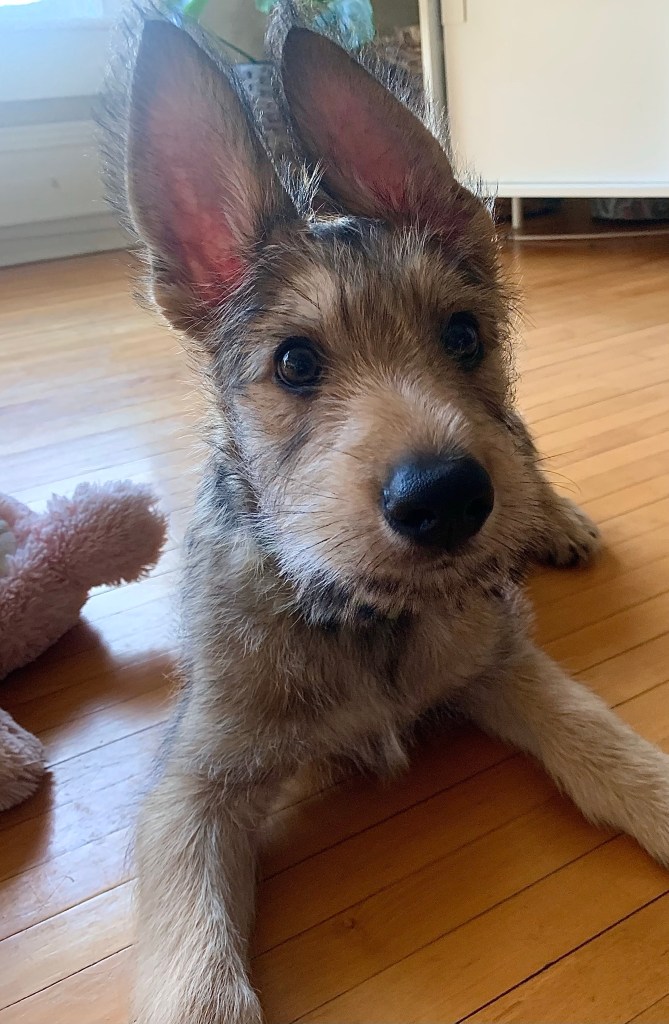 Howdy blogees! Elroy here with some exciting news! The population of Berger Picards in Nova Scotia has just gone up by 16% – if my math skills are correct. Yup – there’s a new kid in town- his name is Tupper – AND he was born in the very same place as moi! But before you all begin to hyperventilate that we have a new addition in our house, I need to let you know that the handsome little lad is living with my girlfriend, Willow. I’m a BIT jealous – but I’ll get over it. Her Highness went to visit him the other day – and said not only is he super cute, but he’s smart too!!!!! Here he is with Willow – this photo was taken by Emma – the woman they own. Isn’t he cute?! I can’t wait to meet him!!!!