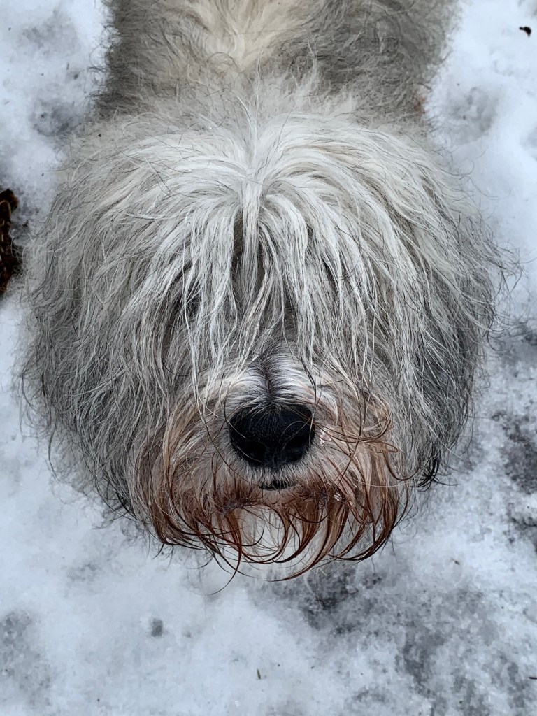 My Enforcer was so pleased with the good news, she decided to take me for a little joy ride. We stopped at a hiking trail and went for a bit of a jaunt. Well – I was jaunting and she was trying to just maintain her balance as the snowy hard-packed trail was a tad icy. We walked for a bit, but when she saw a man approaching from the opposite direction – with two dogs, we did a complete 180. She had visions of yours truly taking her for a “greeting ride” on the ice – and she knew it was much more likely that she would end up injured than me. No sense of adventure.