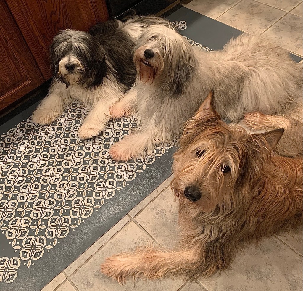 During some recent bad weather, she decided to make a new project. She made something called a floor cloth. Except it’s not made of cloth. Go figure. It’s made of vinyl – and she painted it with a stencil. She did it in the garage – so we canines have not been allowed in there since this project began. It goes back to the whole “dogs and paint” issue. She didn’t want us walking over her newly painted “rug”. So to prevent paw prints and dog hair, we were banned. And even after it was painted, she put some coating on the top, and that had to dry for like forever. Well she finally dragged the 3 x 6’ thing into the kitchen yesterday, while we were all sequestered outside. We watched with great interest through the olfactory art on the deck door, shouting out our opinions as to placement of the new decor.