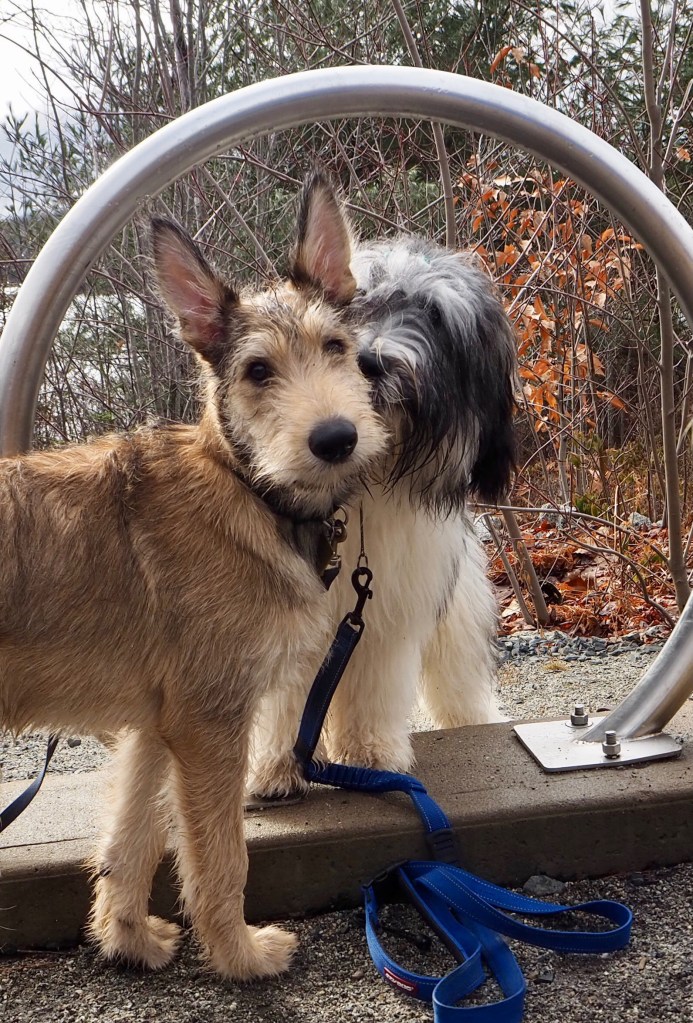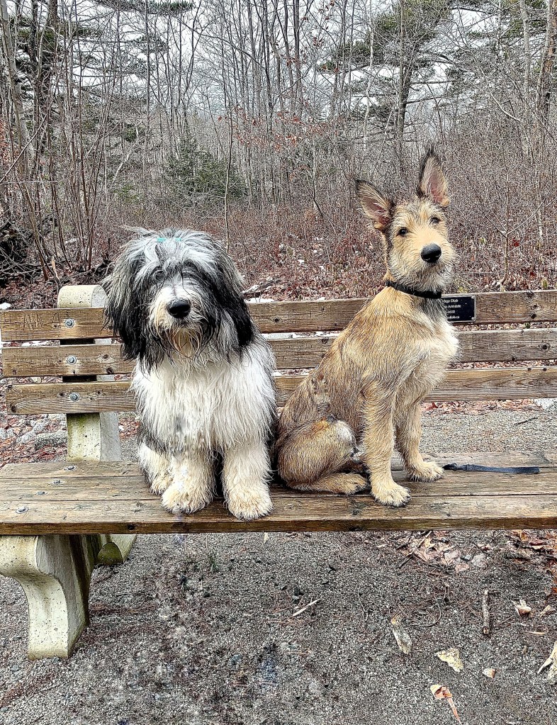 The trails we went on were a bit wet and muddy. Somehow the Coyotes looked exactly the same at the end of the walk, but yours truly looked nothing like I did after my morning grooming. My Enforcer said I looked like a woodland stray. Note my rugged look on the photo on the bench…