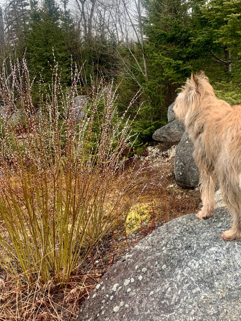 You see, when we go for our walks on the golf course, there is a particular pond/swampy area that is surrounded by giant rocks. And all the rocks are different shapes. But in the past few days, both of us have started this little game of running and jumping from rock to rock. Like a natural agility course! Sometimes I just stop and stand there – like in the photo. The imp loves doing it too – but he can be trusted off leash. Me? I’m tethered. Probably because I would end up in the water. Or off chasing bunnies. The little cottontails have almost changed in color from white back to brown. They’re kinda bold – probably because they know I’m on a leash. They literally run through the woods – parallel to us on the path. All the while I’m increasing Her Highness’ arm length..