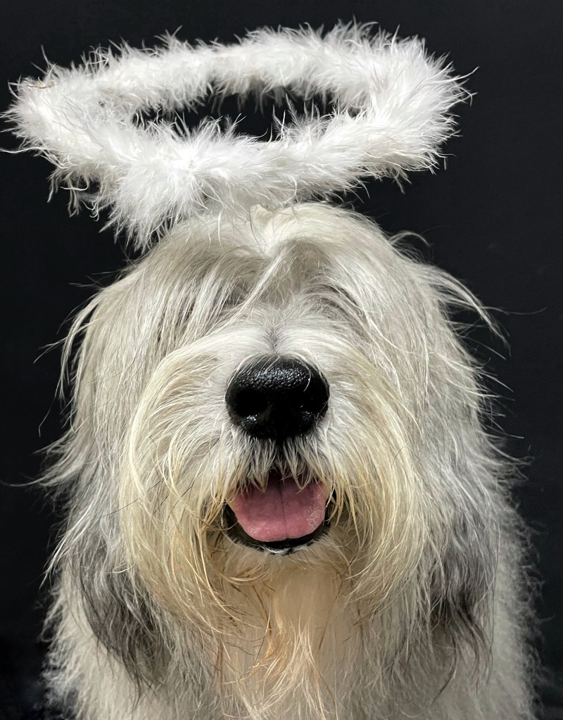 The Coyote REFUSED to even go in the garage also known as the grooming torture palace, the photo studio, the repository for “stuff” and the place where Ludwig lives – because we told him about the halo. The Warden begged him, but he was NOT going to put anything on his head after the weird pumpkin headbands. That top photo is one we forgot to share the other day. His ears are almost up. Or at least one is. Anyway, she conceded halo defeat. This time.