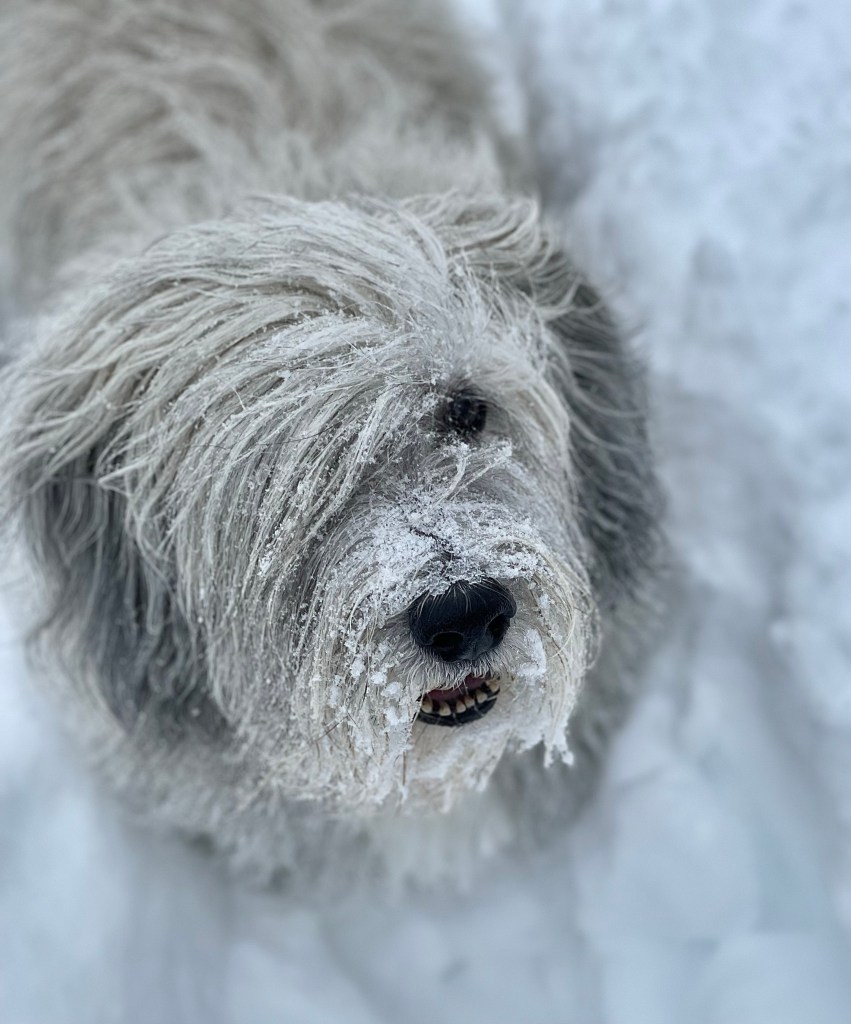 However, yours truly was NOT impressed with the large snowfall we had the other day. I was in NO hurry to go out for my morning constitutional because I had been following the weather channel all night, and I KNEW what lie ahead before I stepped out the door. The Imp went out first, plowing a rather erratic path along the driveway. He jumped and hopped his way along, finally stopping half way up to the road and he did his “business.” He actually would have stayed outside longer, but giant snowballs were forming on his body so he was quite happy to come inside.