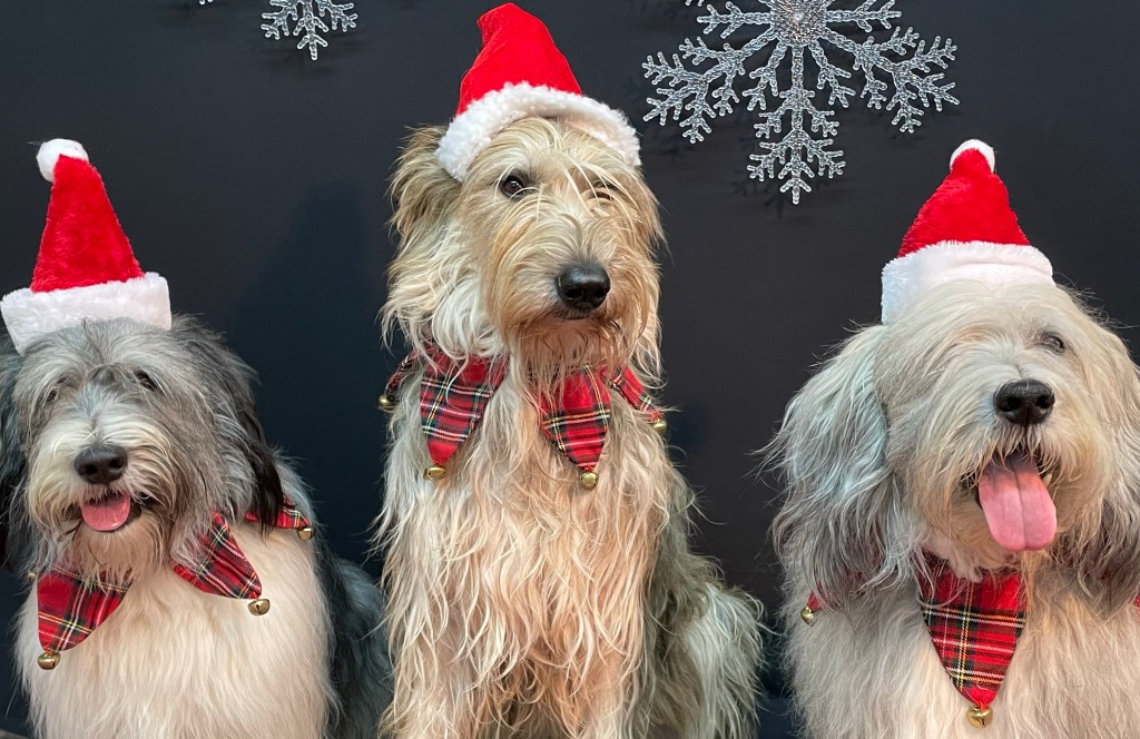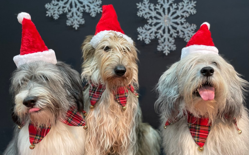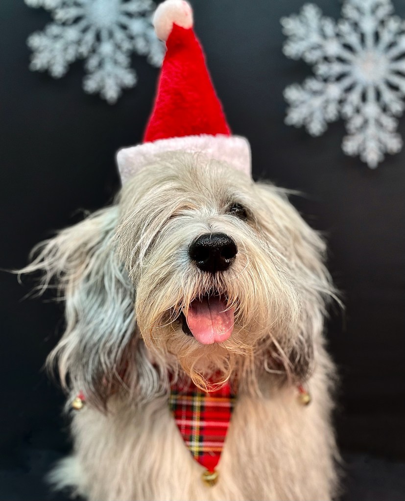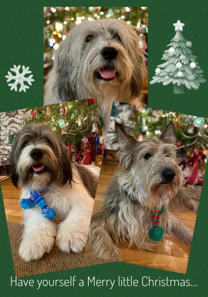 Howdy blogaroos! It’s December the 23rd. The last FULL shopping day for Santa. And I’m thinking this is IT for sending my letter via email or text to the guy in red. The problem is – I’ve been busy! I’ve had some classes this week, I’ve been on walks, I played in the snow (before it rained), I’ve been on delivery guy patrol – AND I’ve had to sit for several photo shoots. Yesterday the Warden said she is DONE with Christmas photos. You’ll see her favorite on Christmas Day- the snow shot we took a few weeks ago. And REALLY – she SHOULD have been satisfied with that. But no. It’s not Christmas until antlers or a Santa hat comes out. This year she decided to skip the antlers. But don’t be sad. She stuffed these little Santa hats with paper – and made us wear them. The Boss said they resemble dunce caps – but he doesn’t care – because these photo shoots involve treats.