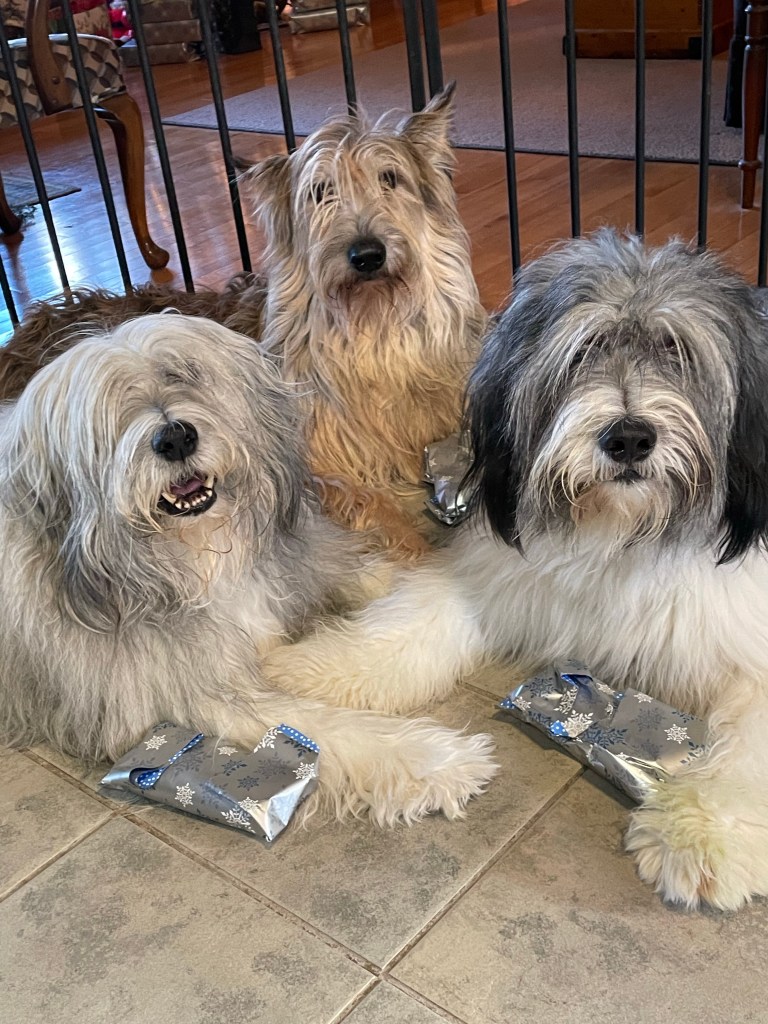 On Christmas morning, we found that Santa left gifts for us under the tree. I guess he lowered or modified his definition of naughty – because yours truly got one too! The photo you see is before the rip fest began. Within seconds I had my gift unwrapped. The Boss unwrapped half of his and then stood and barked at the Warden because it wasn’t edible. It was these super tough indestructible hard rubber chew things. The Coyote didn’t want to bother opening his. Anyway, I started chewing and chewing. The Warden watched me like a hawk. I left mine and started chewing the Boss’s because he didn’t care. Then I went back to mine. The Warden was SO impressed! They were standing up to jaws!!! She thought we could do ads for the company. She could see the money for modeling fees rolling in. Yeah – well 10 minutes later, I chewed off the first piece of rubber. All toys were collected and will probably be donated to some rescue that takes care of dogs without teeth. Good thing she also bought a bulk supply of bully sticks. THAT I can have!!