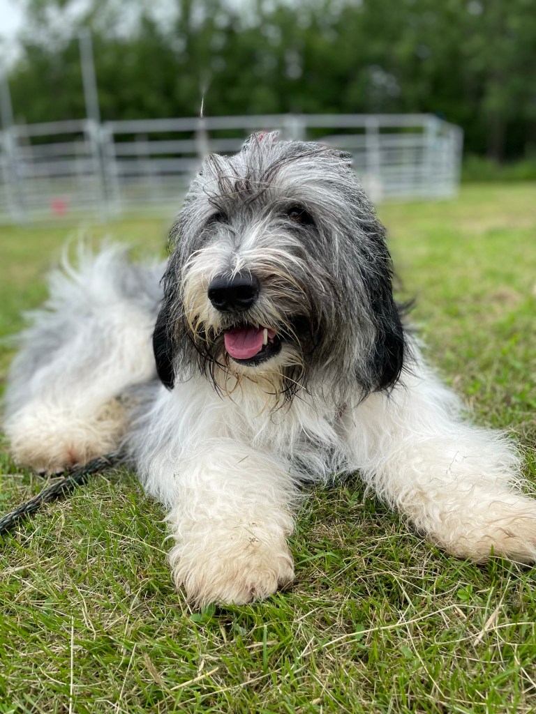 So after watching numerous other dogs – many successful, and some not so much – it was my turn. I was attached to the paracord and in we went. I immediately began to scan for morsels. But after the Warden said “leave it” I looked around to see what else there was to do. Sheep. I took a look, and after them I went. So quickly that the Warden could not hold onto me with the paracord. One of the examiners took the cord and shouted “he’s strong!” Yup – and I had a new game. For about 30 seconds, the Warden was thrilled . Finally a PON who was interested in sheep. I was going around the ring and she was shouting “awesome – good boy- easy” – probably so many times that the examiner – who was likely protecting her own hearing – said the Warden could be a bit quieter. Right about then the Warden shouted for someone to get a camera. Unfortunately, my moments of brilliance were never captured because just as I got really close to the sheep – from what seemed like out of nowhere, a flag was dropped in front of my face. In race car driving they drop the flag to make you go. In sheep herding, they drop a flag to make you stop. And stop I did. Permanently. Yup. I’m a sensitive guy who doesn’t bounce back well from being told no. Surprise. So with that dropped flag, I quit. I mean who needs to be told no. OK – OK I guess I DO need to get over it- but I didn’t. And even after a break, when I went back in later, I had no interest in playing the game. I was being a drama king. Just like The Boss.