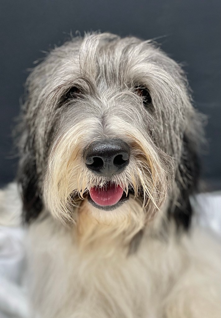 Fast forward to yesterday morning. It was super foggy during my sunrise walk- and the combo of my foggy wet coat with dried mud from the trail, made for a perfect mud spa appearance. Mostly on my feet and belly. So when I got home, I marched into the garage, all prepared for a quick rinsing in the tub – of my feet and belly. I stood like a little soldier as the water turned brown in the tub. The Warden lifted me onto the grooming table and gave me a good towel dry. So I was damp but clean. And then she had this bright idea. She would try some of that new detangling spray. She grabbed the bottle and spritzed some on my back and either side. With a final spritz on my butt. She sprayed some on her hand to check the fragrance. “Gee” she thought, “ it smells fresh and clean, almost like an all-purpose cleaner.” And then she looked at the bottle more closely. She had not sprayed me with the detangler she had been given – but household cleaner that she had been using for something the day before. And which she had left on the grooming table. Her eyes popped out of her head. She whisked me off the table and back into the tub and quickly doused me in water. Now I should add that this thankfully wasn’t a cleaner with caustic agents or bleach- but still, clearly not designed for dogs. She saturated my coat and then shampooed me. Three times. I think once would have been plenty. Then I was half dried with the jet engine dryer. All while the Coyote was still waiting for his walk. With his legs crossed.