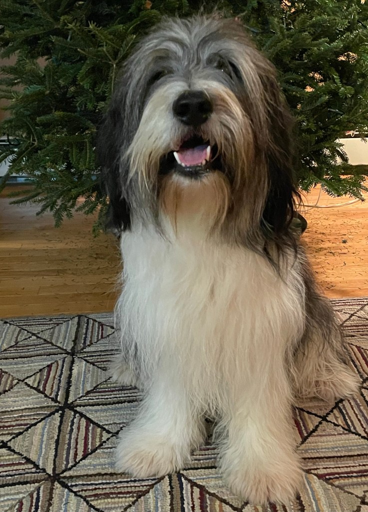 When she arrived home, she sequestered us on the deck while she brought it in. Let’s face it- dragging a tree with three curious canines would not be an easy task. We’re busy, inquisitive guys – what can I say? Once the tree was safe from us in the DFZ, she let us back in the house. I watched as the Warden wrangled the tree in the stand and after it was secure, she took fish line and tied it to the wall. Apparently there’s some story about a fallen tree many years ago – before my time. So now trees are extra-secured. I watched with great curiosity. The other two guys didn’t care at all. The Boss said this is the 13th tree he has seen – so the process is pretty routine. He’s waiting to sit in front of the finished product for the obligatory photo shoot – with treats, of course. You’ll note I DID get to take one photo with the new green guy, much to the consternation of the other guys. Hey- that’s what happens when you pay attention to the proceedings.
