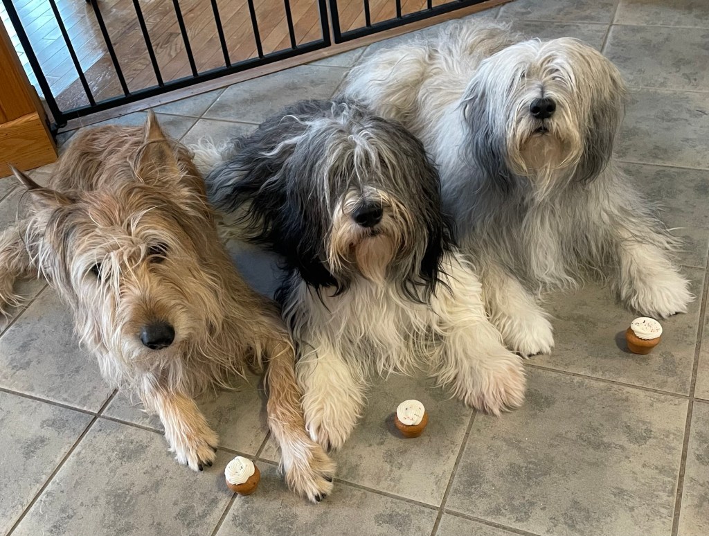 In other, brighter news, I had a marvelous 14th birthday. We had special treats for the occasion- little canine cupcakes for each of us. You see them in the above photo. We were instructed not to touch them – hence our serious expressions. The Imp and I quickly consumed ours, while the Coyote batted his around and then walked away. While the lad is eating fairly well – he still remains particular about new foods. The cupcake was not in his previous dining experiences- so he opted to leave it. But not to worry – food never goes to waste in this house. Not with two PONs.
